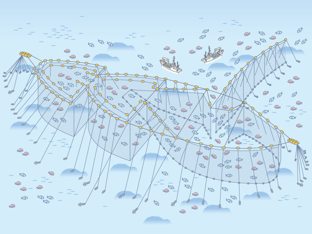 沖合に大きな定置網を設置し、海を回遊する魚をとらえる伝統的な漁法のことです。網を固定して魚を待つため、魚を追い回さず、海の恵みを持続的に得られるのが特徴です。