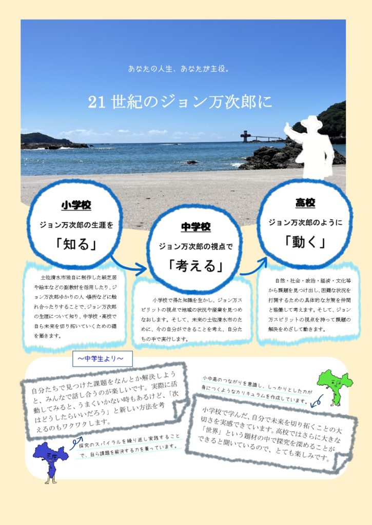 教育の魅力化 トップ 2025.04.022025.10.14 探究的な学び 土佐清水市では、郷土の偉人ジョン万次郎の生き方について知ったりジョン万次郎のように考えたり行動したりする活動を通して、自分自身の力で未来を創る力=「ジョン万スピリット」を育んでいきます。その軸となるのが「総合的な学習の時間」です。 小学校ではジョン万次郎の人生を「知る」、中学校ではジョン万次郎の視点で「考える」、そして高等学校ではジョン万次郎のように「動く」活動を通して、自分の未来を自ら拓くことのできる力を育みます。 教育委員会 最新記事 2週間の語学留学(CEFR A1スタート) 2025.10.14 年代・国籍様々な人の語学留学感想 2025.10.14 3週間の語学留学(CEFR B1レベルスタート) 2025.10.14 見て、感じて、考えて――中学生が出会った「土佐清水の力」【ポミエ 編】 2025.07.29 見て、感じて、考えて――中学生が出会った「土佐清水の力」【土佐清水食品株式会社 編】 2025.07.22 記事の一覧はこちら 土佐清水市内教育機関等一覧