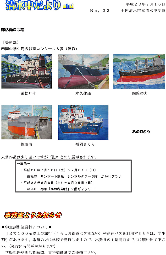 清水中だより mini No.23