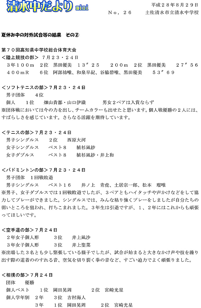 清水中だより mini No.26