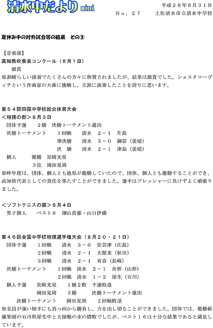 清水中だより mini No.27