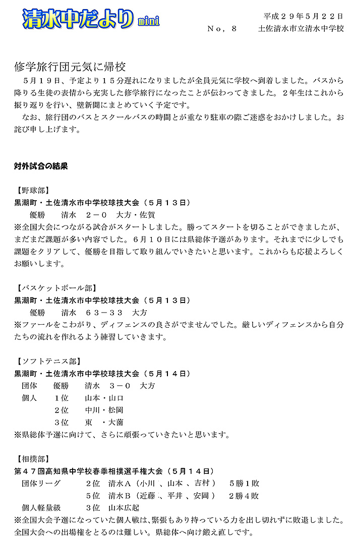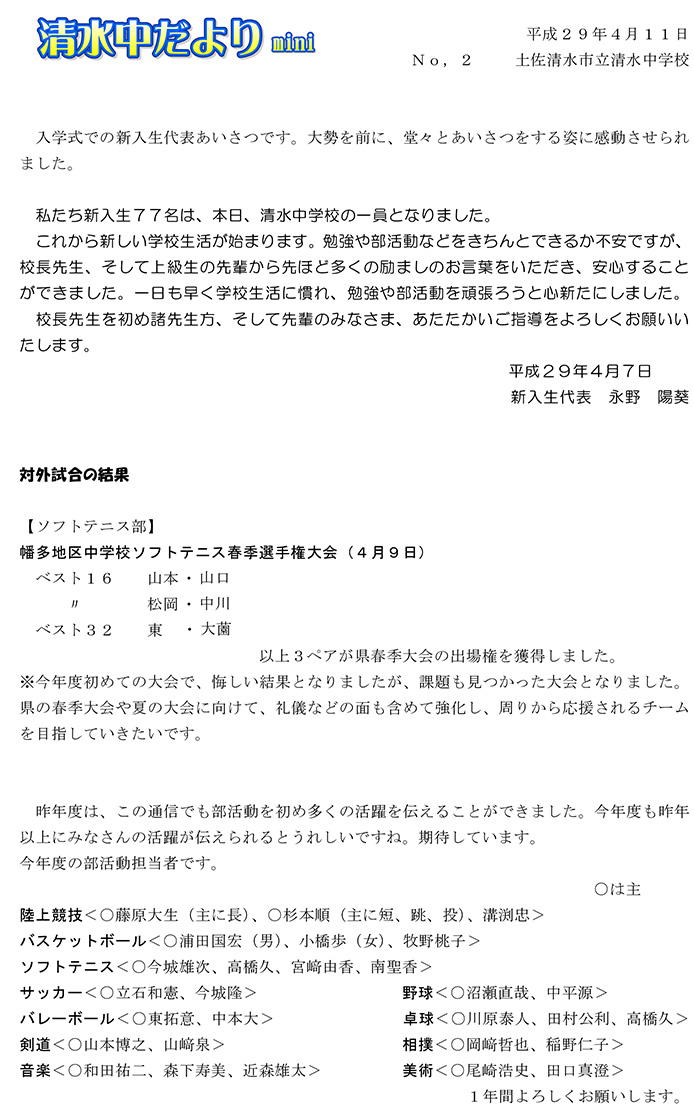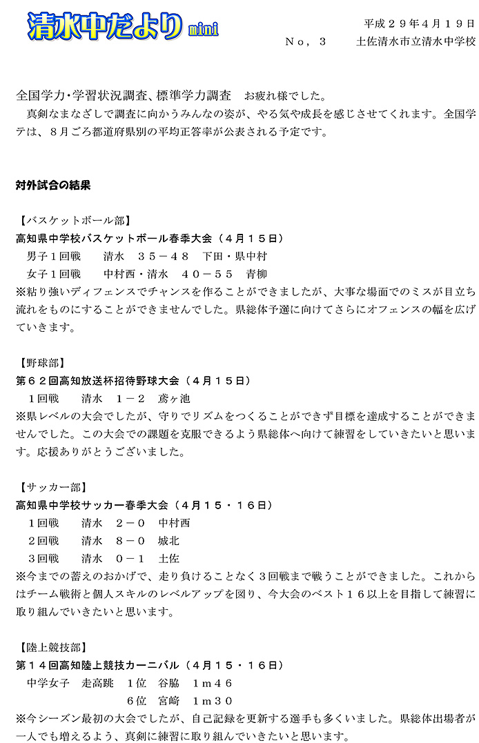 2017年度 清水中だより mini No.1