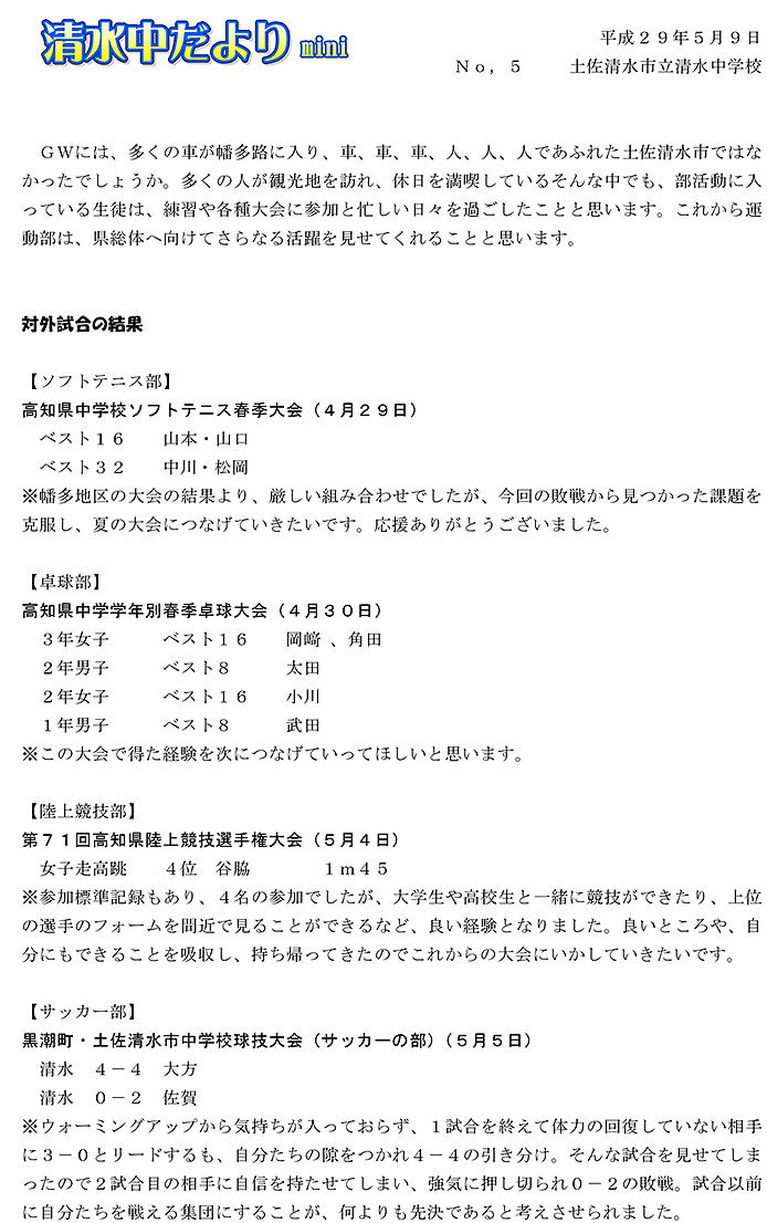 2017年度 清水中だより mini No.5