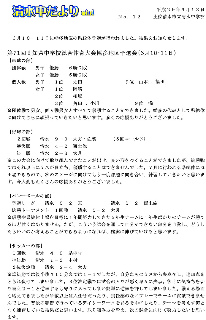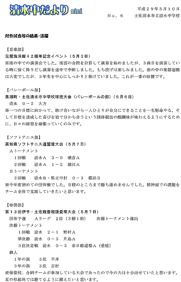 2017年度 清水中だより mini No.6