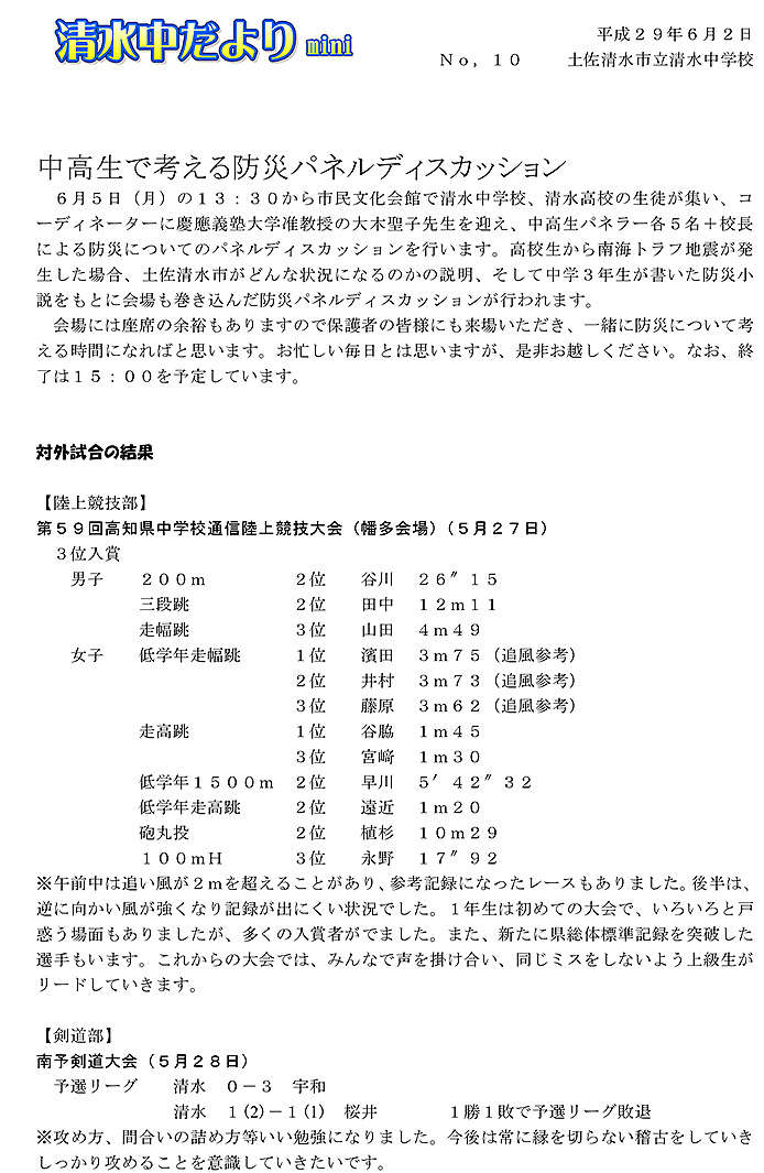 2017年度 清水中だより mini No.10