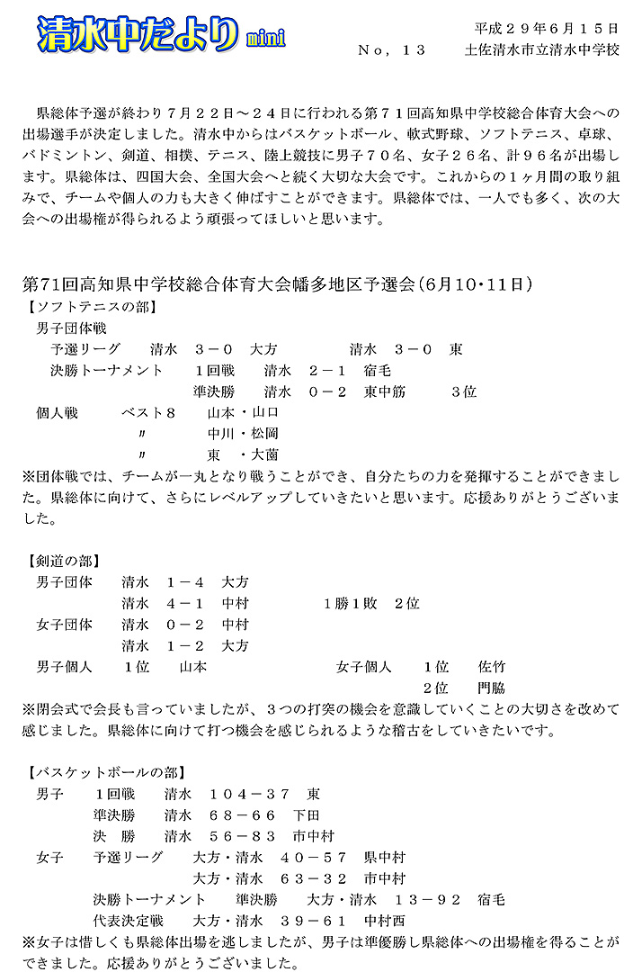 2017年度 清水中だより mini No.13