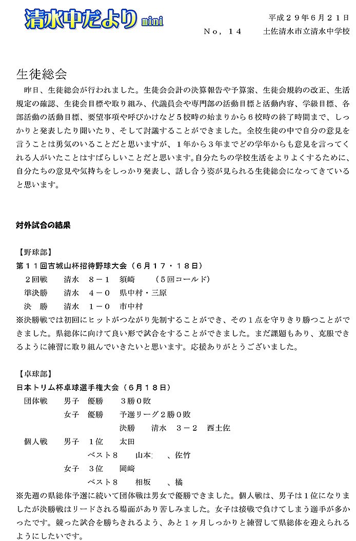 2017年度 清水中だより mini No.14