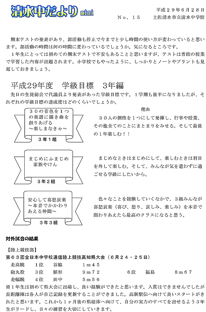 2017年度 清水中だより mini No.15