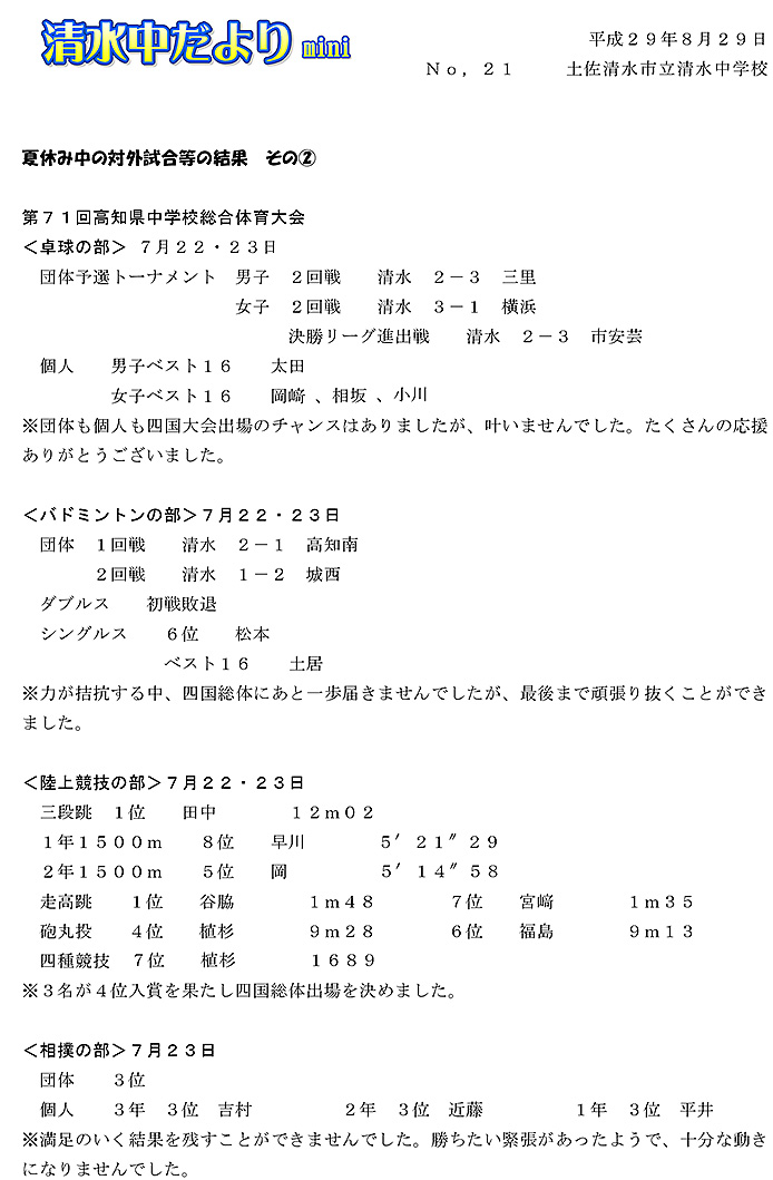 2017年度 清水中だより mini No.2