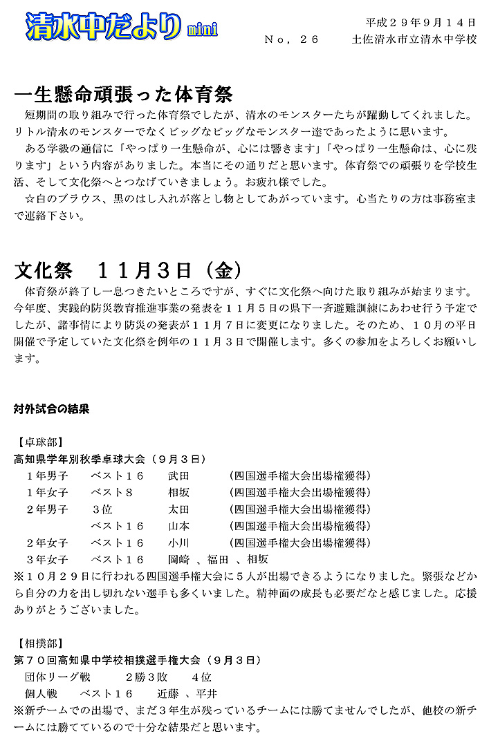 2017年度 清水中だより mini No.26