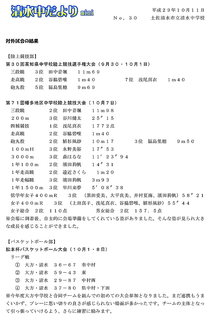 2017年度 清水中だより mini No.30