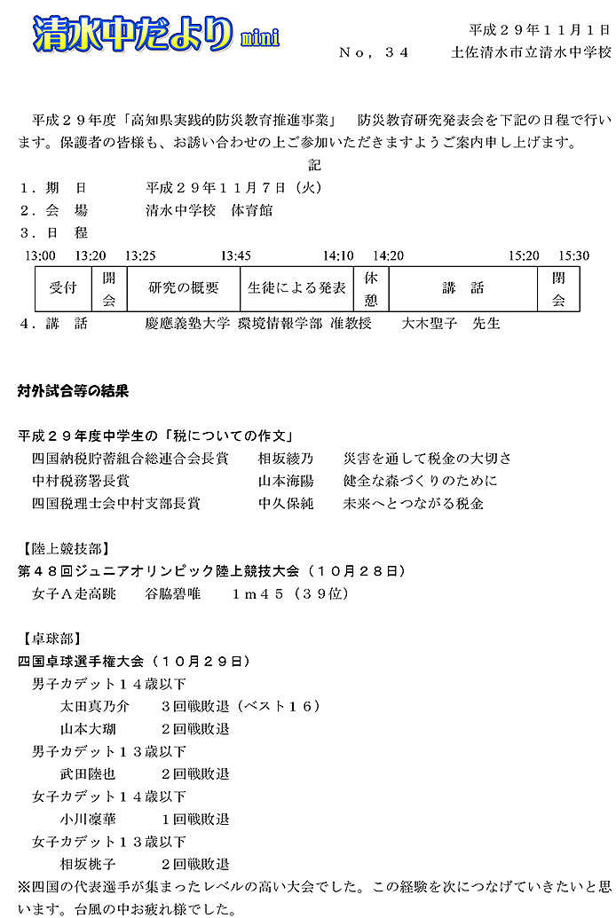 2017年度 清水中だより mini No.34