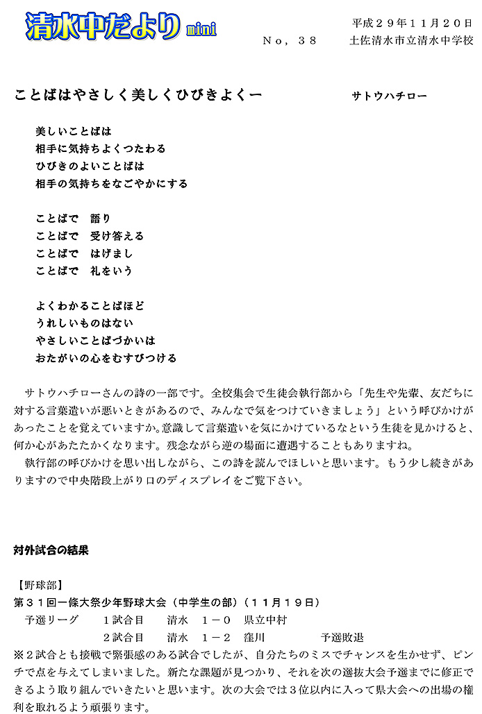 2017年度 清水中だより mini No.38