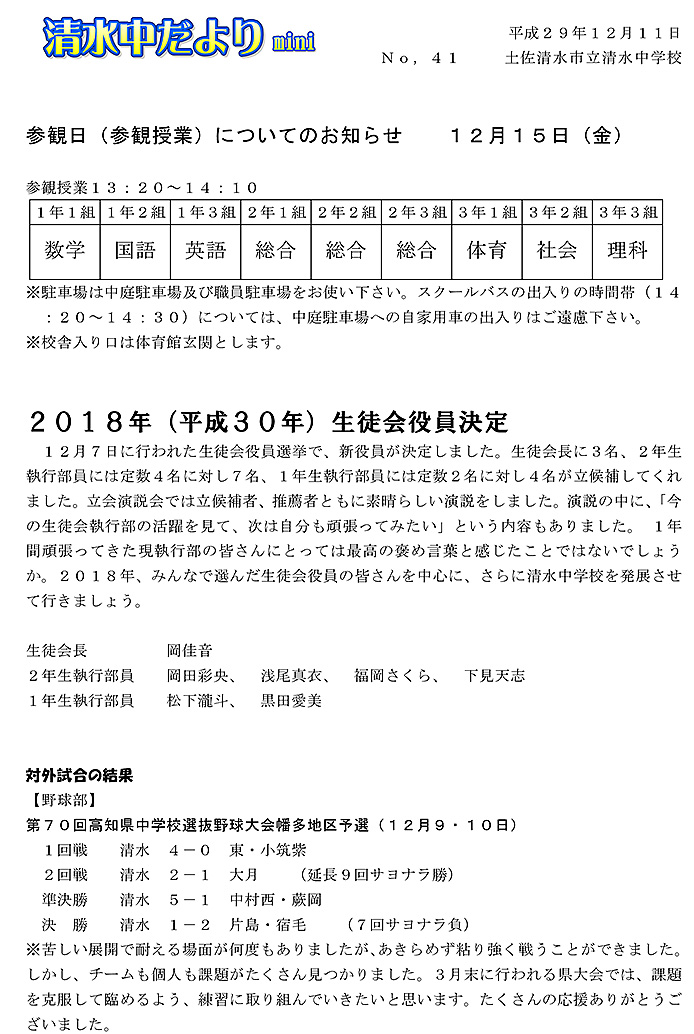 2017年度 清水中だより mini No.41