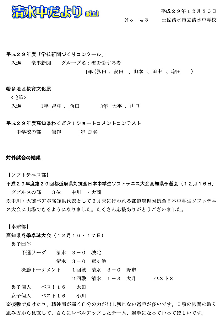 2017年度 清水中だより mini No.43