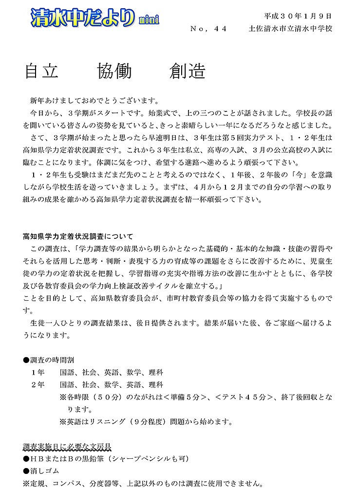 2017年度 清水中だより mini No.45