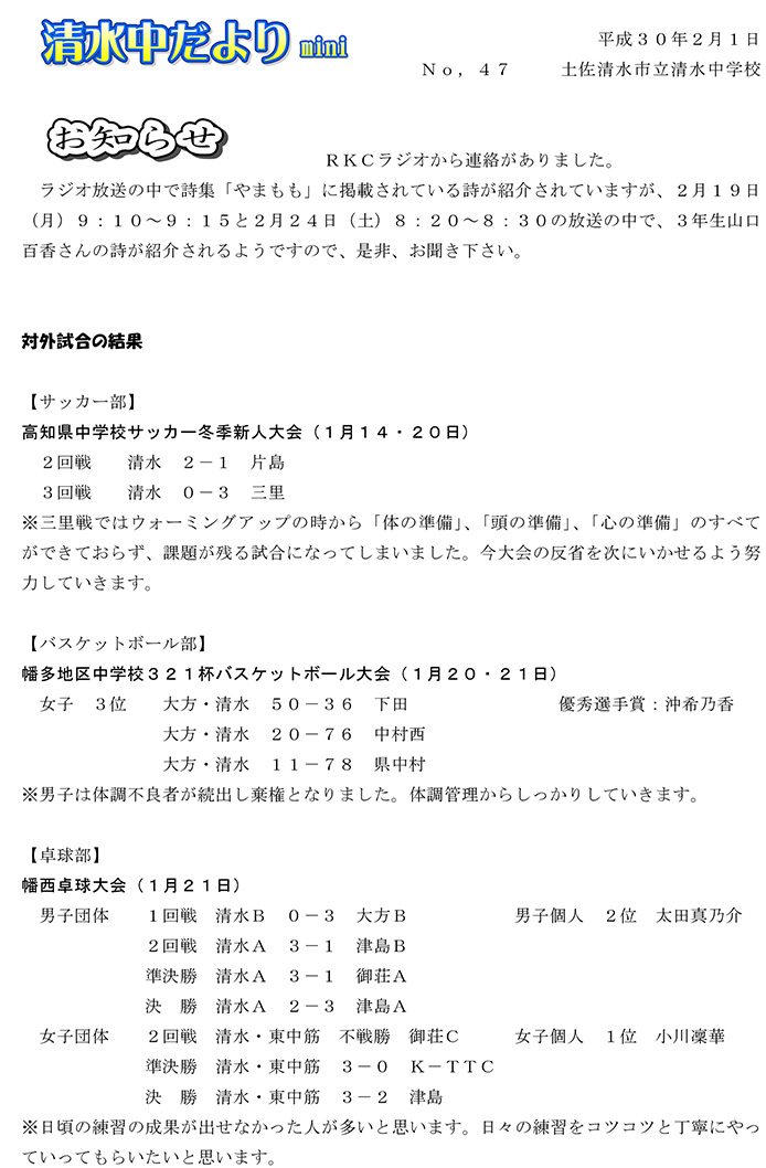 2017年度 清水中だより mini No.47
